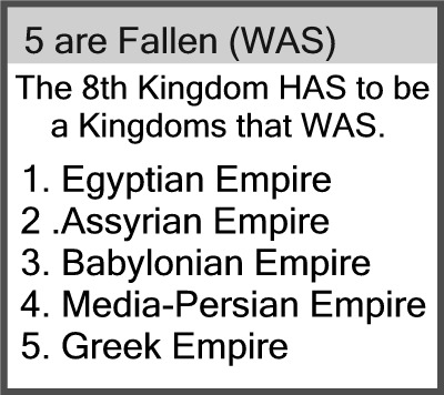 “Five are fallen” tells us that five of these kingdoms no longer exist. Then it states that “one is”, meaning this is Rome; the one in power when the Disciple John wrote Revelation. We are then told “and the other is not yet to come,” which tells us there is a seventh kingdom coming.