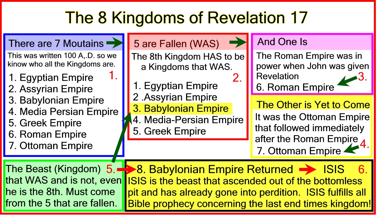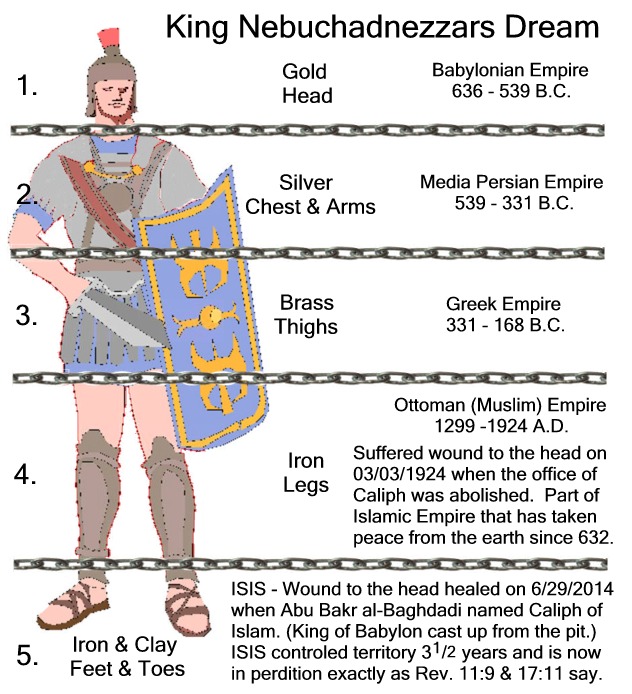 “And the beast that was, and is not, even he is the eighth, and is of the seven.” This is stating that the kingdom that is the answer to this riddle is one of the kingdoms “that was.” It is one of the first five kingdoms that have fallen. This kingdom will be the 8th kingdom and he will be one of the previous seven kingdoms. This verse eliminates the possibility of the answer to the riddle being the Roman Empire. The Roman Empire could not be one of the first five kingdoms. The first five kingdoms in order were the Egyptian, Assyrian, Babylonian, Media Persian and lastly the Greek Empire. This is actual history which cannot be changed unless you are a progressive revisionist, and even they can’t change the truth. (But that doesn’t stop them from trying!) When this was written during the time of the Apostle John, Rome was the kingdom that “is.” There are actually 8 Kingdoms spoken of in Revelation 17. You have just seen that the empire that followed the Roman Empire was the Ottoman Empire which would make it the fourth and “Iron Kingdom” of Daniel 2. The fourth kingdom of Nebuchadnezzar’s dream is the seventh kingdom of Revelation 17. Anyone that believes that the Roman Empire is the fourth kingdom of Nebuchadnezzar’s dream is saying that the sixth, seventh, and eighth kingdoms of Revelation 17 are all Roman Empires. In essence you are saying that there will be two more appearances of the Roman Empire before our Lord returns. This is absolutely ridiculous and there is NO-WAY this is going to happen. The belief that Rome is the 4th kingdom of Nebuchadnezzar’s dream is further complicated by the fact that both the 4th and 5th kingdoms of Nebuchadnezzar’s dream which are 7th and 8th kingdoms of Revelation 17 have already been here and gone. We are now in the second year of the last 3½ year period before our Lord returns. If you think this statement is in error, just keep reading and take note of what the Word of God says and how well it fit’s Islamic history and teaching. If one would just take the time to sit down and study Bible Prophecy they would see just how far off the present day interpretations of Bible Prophecy REALLY are.