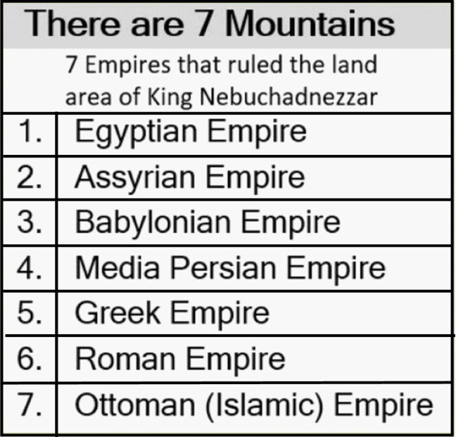 “The seven heads are seven mountains” In Middle East speech and in scripture a mountain is a metaphor for a kingdom or empire. This is a common analogy that still exists today in the Middle East. The Bible also refers to these same kingdoms or empires as beasts; sometimes literally and sometimes by the names of beasts. Good examples of this are found later in Daniel where these mountains are called names of beasts; like a lion, ram, and bear.